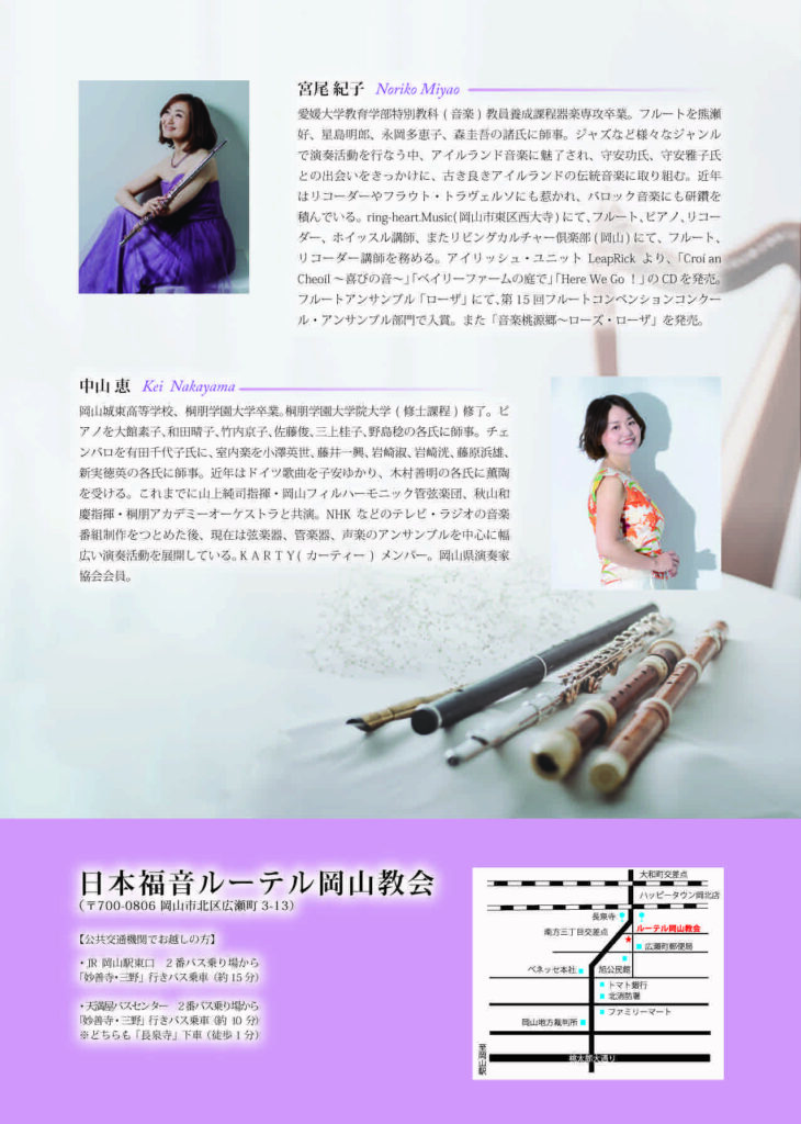 また、フラウト・トラヴェルソ(フルートの祖先となる木製の横笛)や木製リコーダーなどで、バロック時代の曲たちを多彩な音色でコンサートを展開させていきます。木製ならではの柔らかで温かみのある音色だけでなく、モダンフルートでは、ピアニストの中山 恵さんによる伴奏で、サン=サーンスの「パヴァーヌ」や、セザール・フランクの「ソナタ」など色彩豊かなフランスの曲を中心にお届けします。アイルランド音楽の活動を通して出会った、膝に乗せる小型のアイリッシュハープの繊細な音色による独奏もお楽しみいただきます。
