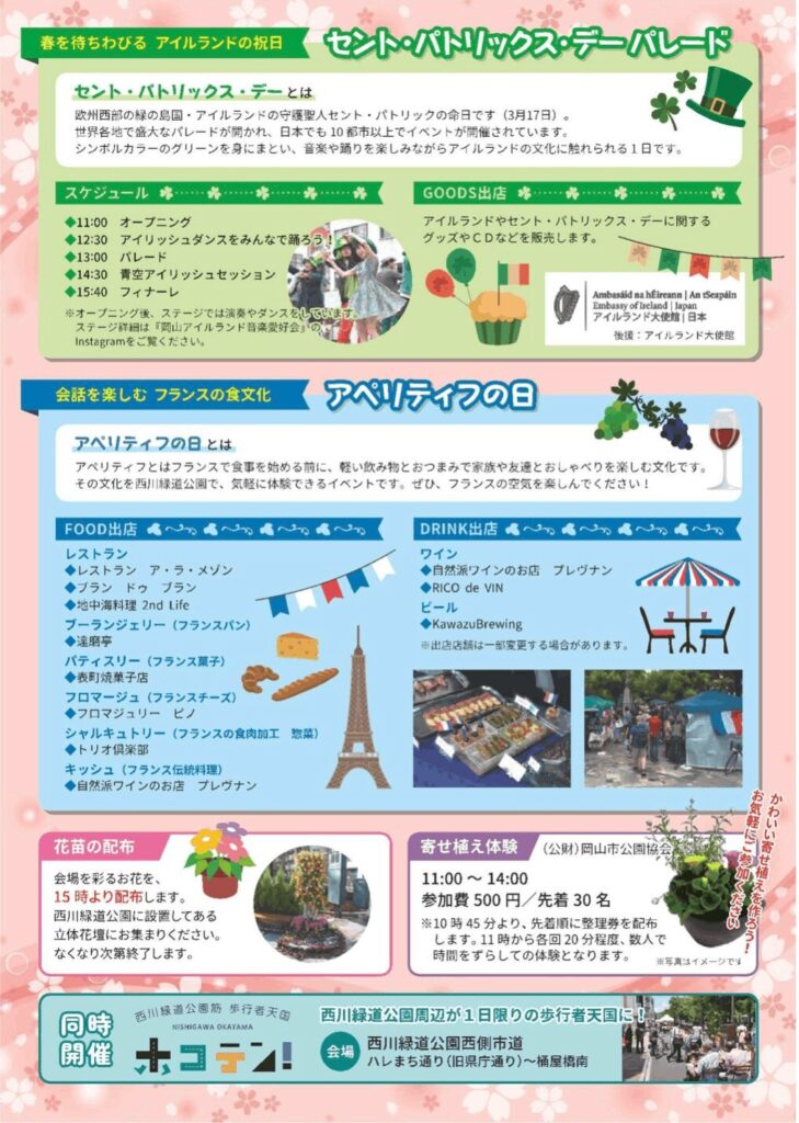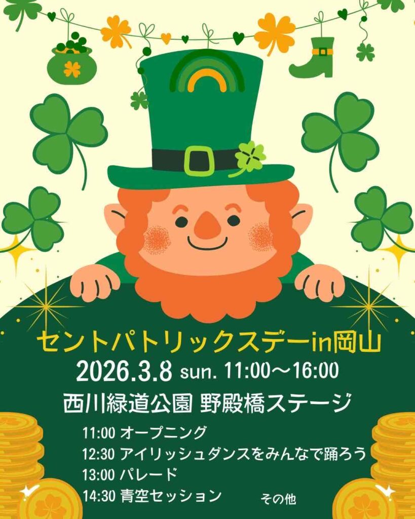 ヨーロッパの西にある、緑豊かな島国アイルランドの最大の祝日セント・パトリックス・デーは、アイルランドにキリスト教を広めた聖パトリックの命日(3月17日)です。映画「タイタニック」でも知られているように、土地が豊かでなかったアイルランドから、たくさんの人々が世界各国に移住したため、アイルランドの文化や伝統も世界に広まりました。セント・パトリックス・デーはアイルランドはもちろん、世界各国でパレードや音楽&ダンスのパフォーマンスでお祝いされています。3月は日本各地でSt.Patrick’s dayのイベントが開催されますが、岡山でも今年は3月8日に開催されます!